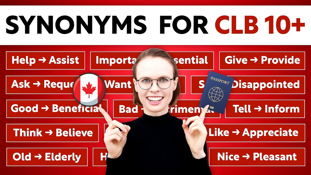 You’ll learn 20 synonyms for the most commonly used words on the CELPIP. Use these synonyms instead of the words that are commonly used to score CLB 10 or higher.