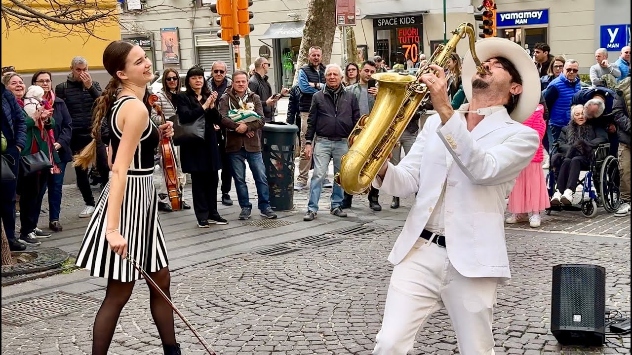 Karolina Protsenko plays on violin with Daniele Vitale Sax. Suddenly police come and stop their street performance. The Italian carnival happens at this time. I hope you like this video.