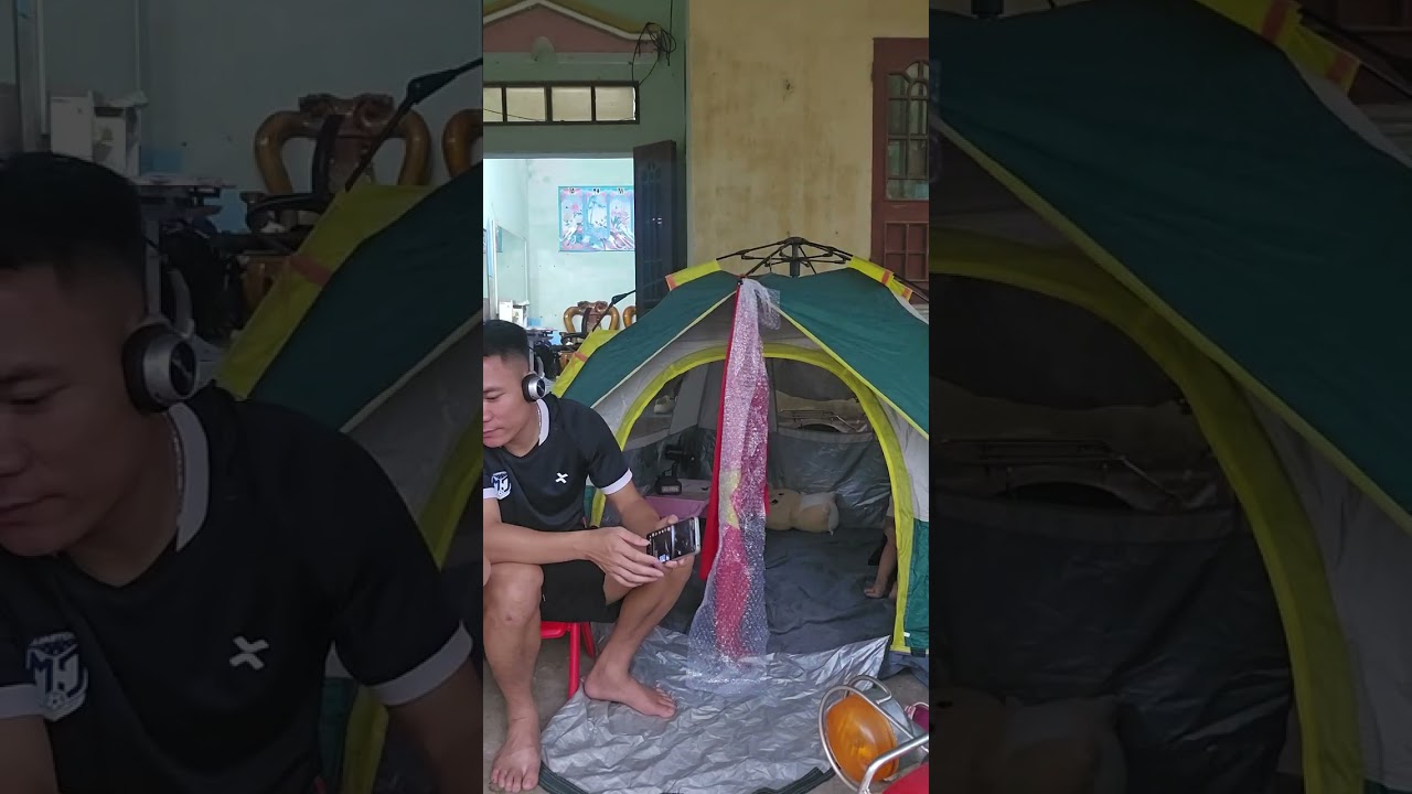 Camping tent with red flag and yellow star door