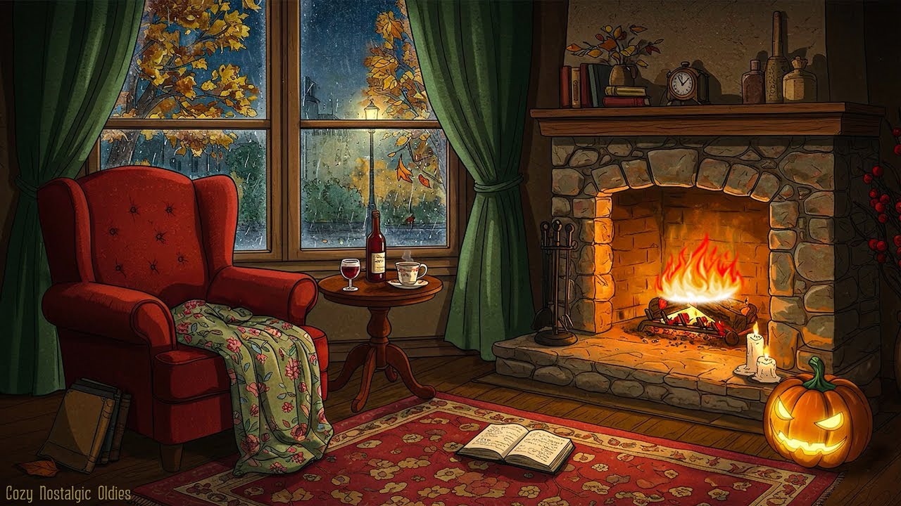 experience a peaceful autumn rainy night in the 1930s, where the warm glow of the fireplace meets the soothing sound of vintage oldies playing softly from another room. the gentle patter of rain against the window and the cozy armchair invite you to relax, unwind, and escape into a world of nostalgia.