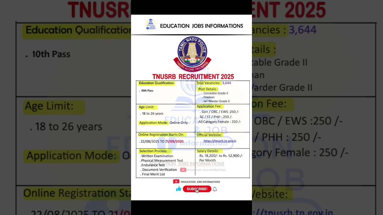TNUSRB RECRUITMENT 2025 | New Vacancy 2025 | Education Jobs Informations #shorts